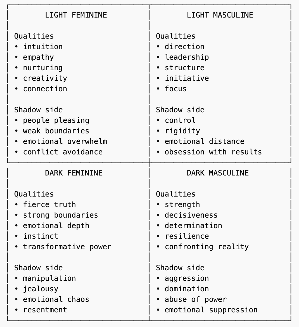 When these energies are balanced, they complement each other. The masculine provides direction and focus. The feminine brings depth, connection, and creativity. But when one energy is suppressed or becomes dominant, it can appear in its shadow form.